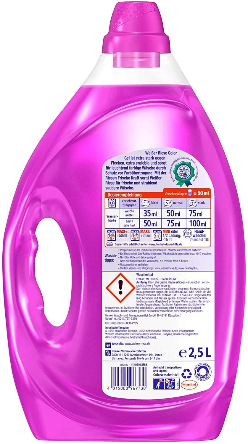 Weißer Riese Color Gel ist besonders ergiebig und sorgt für ein leuchtendes Farbergebnis. Die Farbschutzformel schont hierbei die Farben, damit diese auch lange strahlen können. Die volle Waschkraft für Ihre bunte Wäsche wirkt bereits ab 20°C. Entsprechend des neuen Industriestandards zur Dosierung von Flüssigwaschmitteln verringert sich die benötigte Menge an Weißer Riese Color Gel pro Waschgang. Dank der verbesserten und konzentrierteren Formel von Weißer Riese werden nur 50 ml des Waschgels pro Waschgang benötigt. Durch diese Umstellung wird nicht nur die Waschkraft gestärkt, sondern gleichzeitig die Umwelt geschont. Weißer Riese Color Gel ist erhältlich in den handlichen Flaschen für 20, 50, 70 und 100 Wäschen. Dieses Flüssigwaschmittel von Weißer Riese ist das ideale Colorwaschmittel für Familien mit Kindern, da es besonders ergiebig ist. Weißer Riese. Riesen Waschkraft für riesen Wäscheberge.